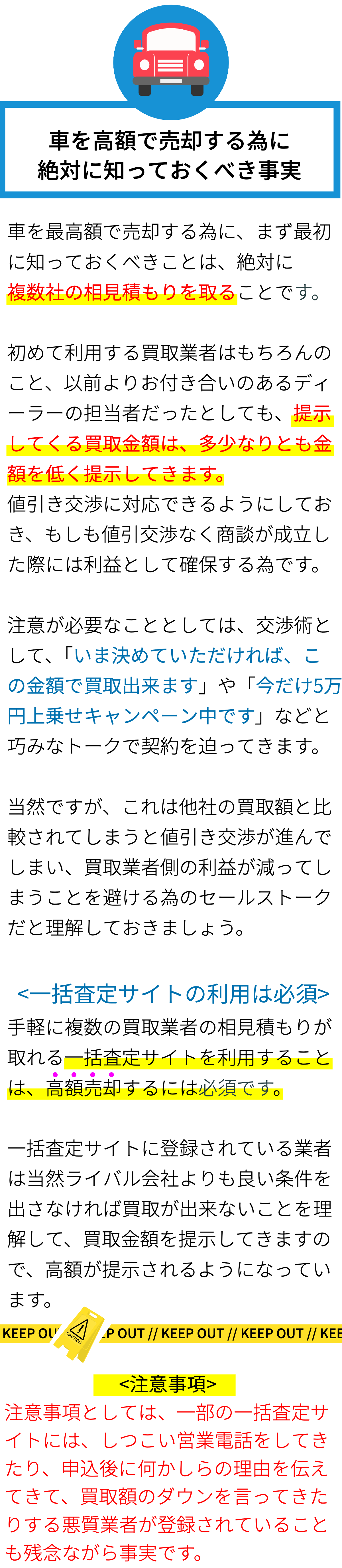車買取一括査定を上手に活用することで、満足のいく売却が実現します。ぜひ活用してみてください。